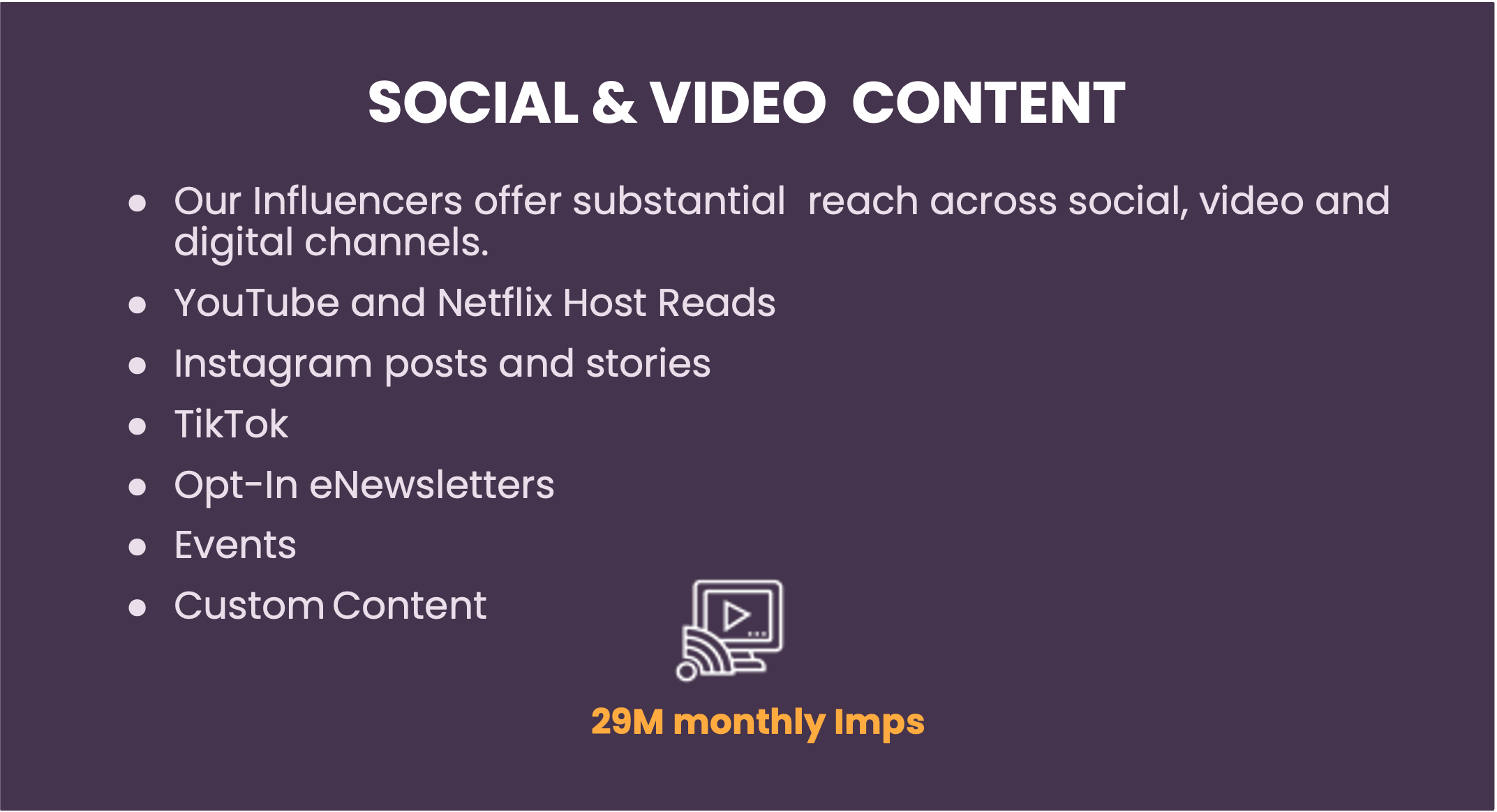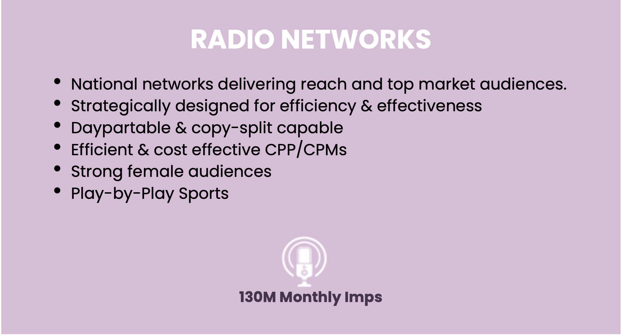 Your brand or client’s message delivered to engaged and qualified audiences you can’t get anywhere else. All with low spot loads, managed frequencies and proven results.